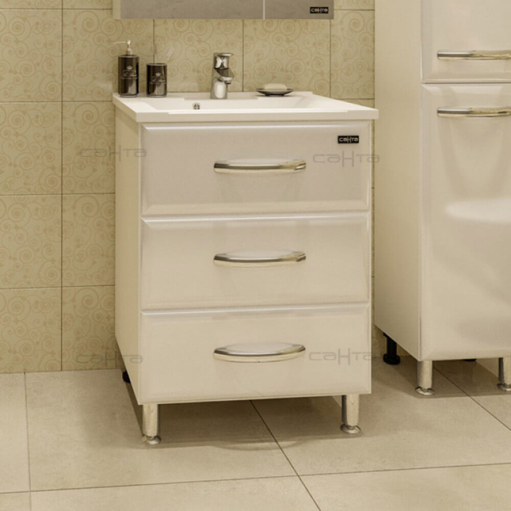 Напольная тумба с тремя выдвижными ящиками и белоснежным керамическим умывальником Kirovit Фостер 60.